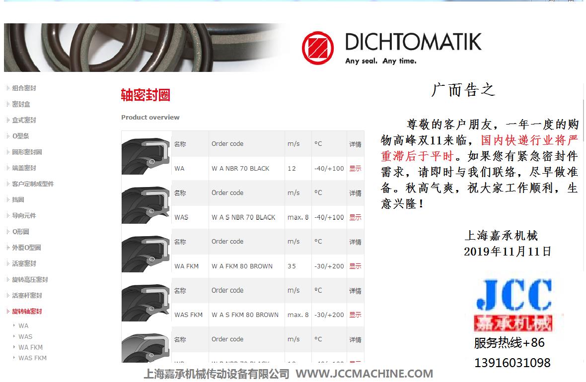 尊敬的客户朋友,一年一度的购物高峰双11来临,国内快递行业将严重滞后于平时。如果您有紧急密封件需求,请即时与我们联络,尽早做准备。